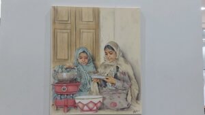 أما الركن الثالث فقد شارك الفرحان بمجموعة من اللوحات الفنية حملت توقيع ابنه حسن ، حيث أخذنا في جولة في انحاء الجمعية التي زينت جدرانها بلوحاته التي امتزجت برائحة ولون الماضي الجميل بما يحمله من تفاصيل يوميةٍ بسيطة .