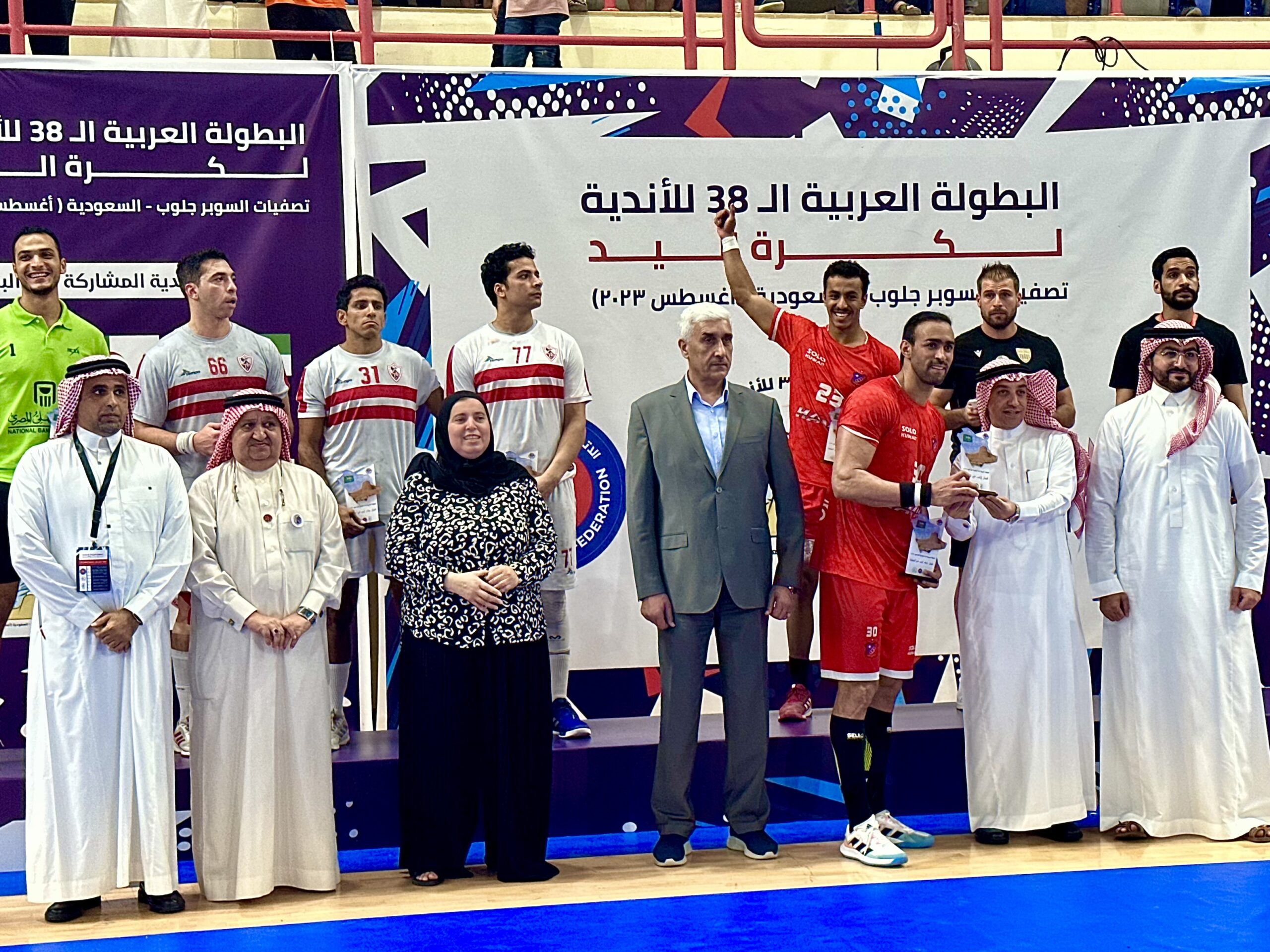 توج معالي نائب وزير الرياضة بدر بن عبد الرحمن القاضي نادي الكويت الكويتي بلقب البطولة العربية الـ 38 للأندية أبطال الدوري والكأس لكرة اليد، عقب تفوقه على الزمالك المصري بنتيجة (31 – 30)، خلال المواجهة الختامية التي جمعت بينهما مساء اليوم الأحد على صالة مدينة الأمير نايف بن عبد العزيز الرياضية بمحافظة القطيف.