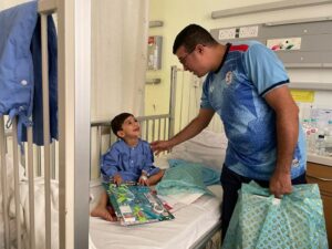 وتم خلال الزيارة توزيع الهدايا والحلويات العضويةعلى الأطفال لرفع معنوياتهم وإدخال الفرحة إلى قلوبهم .