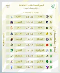 واصلت أندية الصفا ومضر والهدى والنور والخليج والمحيط، حصدها العلامة الكاملة بواقع 6 نقاط، مع ختام مباريات الجولة الثالثة من بطولة الدوري السعودي الممتاز لكرة اليد لدرجة الناشئين للموسم الرياضي 2023-2024م، والتي جرت اليوم الخميس 07 سبتمبر 2023م بإقامة 10 مباريات.
