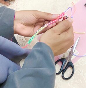 واستعرضت المدربة خلالها عدة محاور تتمثل في أنواع الخيوط ، وتعلم الغرزة الرئيسية بفن المكرميات، وصناعة الاساور والخلاخيل والقياسات المناسبة، وطريقة حرق نهاية السوارة.