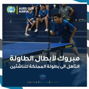 تمكن لاعبو كرة الطاولة لفئة الناشئين (الرجال) بتحقيق المركز الثاني في بطولة دوري محافظة الاحساء لكرة الطاولةالتي اقيمت في صالة الطرف خلال الفترة 17/11/2023م إلى 19/11/2023موقد مثل فريق كرة الطاولة اللاعبين:محمد حسن القرين