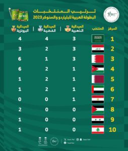 وجاء تصدر المنتخب السعودي للترتيب بعد ان حقق لاعبوه 11 ميدالية ملونه بواقع ” 3 ذهبيات و4 فضة و4 برونزيات “ وجاء منتخب العراق في المركز الثاني ومنتخب البحرين في المركز الثالث في الترتيب العام .