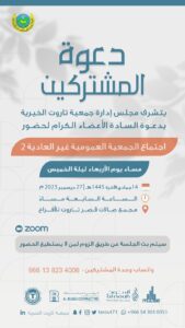 وجه مجلس الإدارة بجمعية تاروت الخيرية دعوة لجميع المشتركين لحضور اجتماع الجمعية العمومية غير العادية الثانية لعام 2023م، الذي سيعقد مساء الأربعاء ليلة الخميس 14 جمادى الآخرة 1445هـ الموافق 27 ديسمبر 2023 م في مجمع صالات قصر تاروت للأفراح والمناسبات ” توليب “.