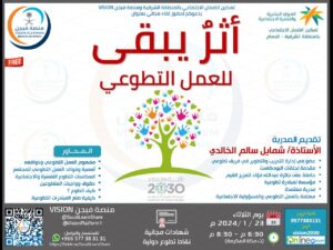 في اطار الجهود المشتركة بين تمكين الضمان الاجتماعي بالمنطقة الشرقية بالدمام وشريك النجاح منصة فيجن وبمبادرة مشتركة تم عقد برنامج مجاني بعنوان ” اثر يبقى ” للعمل التطوعي مساء يوم الثلاثاء الموافق : 23يناير 2024 تقديم المدربة : أ . شمايل سالم الخالدي شارك فيه اكثر من ٢٠٠ مشارك من جميع انحاء ومناطق المملكة ويهدف البرنامج الى تعريف المتدرب على ماهية العمل التطوعي ودوافعه واهميته للمجتمع وانعكاساته النفسية و الاجتماعية الى جانب كيفية صنع المبادرات التطوعية كما عرضت المدربه من خلال البرنامج عدد من المواقف والتجارب الحياتية في مواجهة تحديات العمل التطوعي وتأتي هذه المبادرة التعاونية بين تمكين ومنصة فيجن في خطوة لغرس ثقافة التطوع لتحقيق التكامل والتكاتف بين فئات المجتمع ضمن مستهدفات رؤية المملكة 2023 الوصول الى مليون متطوع