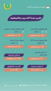 وذكرت منسقة لجنة التدريب والتوظيف سجود آل يعقوب بأن وحدة التدريب والتوظيف نظمت خلال عام 2023م ثلاثة ملتقيات وظيفية ونشرت 57 إعلانا وظيفياً ، كما ساهمت في تدريب 167 متدرباً عبر 8 ورش تدريبية نظمتها الوحدة .