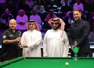 بارك رئيس الاتحاد السعودي للبلياردو السنوكر الدكتور ناصر الشمري لمعالي رئيس مجلس إدارة الهيئة العامة للترفيه (GEA) المستشار تركي بن عبد المحسن آل الشيخ نجاح النسخة الأولى من بطولة “موسم الرياض” للسنوكر (البلياردو الإنجليزي)، والتي اختتمت فجر اليوم الخميس وتوج معالي المستشار تركي بن عبد المحسن آل الشيخ، اللاعب الإنجليزي روني أوسوليفان بكأس بطولة ماستر العالم في السنوكر بعد فوزه في الجولات النهائية للبطولة مقابل نظيره اللاعب البلجيكي لوكا بريسيل بنتيجة ٥ – ٢
