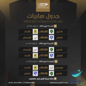 تنطلق غداً الاحد بطولة كأس الاتحاد السعودي للكرة الطائرة بمشاركة أندية الهلال والاتحاد والابتسام والخليج التي وصلت للدور النصف النهائي ( المربع الذهبي ) وستقام مبارياتها على صالة الامير نايف بن عبدالعزيز بالقطيف خلال الفترة من 14 الى 17 من شهر أبريل الحالي وتقام البطولة بنظام الدوري من دور واحد ويشهد اليوم الاول من البطولة اقامة مباراتان