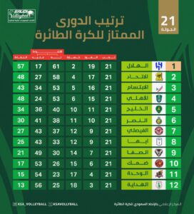 تختتم غداً الاحد منافسات الدوري الممتاز للكرة الطائرة ( الجولة الاخيرة ) باقامة ست مباريات ، وسيتم تتويج الهلال بلقب كأس البطولة والميداليات الذهبية بعد تحقيقه المركز الاول 57 نقطة بعد نهاية المباراة التي ستجمعه مع الاهلي على صالة وزارة الرياضة بجدة 6 مساء يقوداللقاء عبدالعزيز الرميحي حكم اول واحمد الرجب حكم ثان وعبدالخالق الصبحي مسجلاً وامين الطريفي مراقباً للحكام