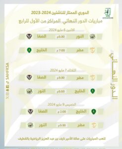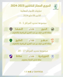 تنطلق يوم غدٍ الاثنين 06 مايو 2024م، منافسات الأدوار النهائية من بطولة الدوري الممتاز لكرة اليد لدرجة الناشئين للموسم الرياضي 2023-2024م، وذلك لتحديد جميع المراكز الترتيبية من الأول حتى العشرون.