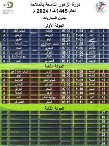 ويتنافس على لقب النسخة التاسعة (١٦) فريق قسمت على أربع مجموعات حيث ضمت المجموعة الأولى (الملاحة ، المرصاد ، الوحش ، شباب النخيل)