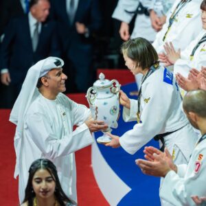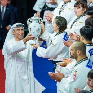 شهد منافسات اليوم الختامي للبطولة، وقام بتتويج الفائزين في منافسات “الفرق المختلطة”، محمد بن ثعلوب الدرعي، رئيس اللجنة المنظمة العليا لبطولة العالم للجودو – أبوظبي 2024، رئيس اتحاد الإمارات للجودو، الذي سلم كأس المركز الأول للمنتخب الياباني، وماريوس فايزر رئيس الاتحاد الدولي للجودو، الذي قلد لاعبي اليابان بالميداليات الذهبية، وعدد من الشخصيات البارزة في رياضة الجودو الذين شاركوا في تتويج منتخبات فرنسا بالميداليات الفضية وجورجيا إيطاليا بالميدالية البرونزية.
