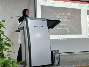 وأوضح المحاضرون طريقة انتقاله إلى البشر من خلال المخالطة الجسدية لشخص معدي أو الملامسة البدنية لمواد ملوثة أو حيوانات مصابة، كما أنه يتم التأكيد المختبري لحالات الإصابة بجدري القردة عن طريق اختبارات تشخيص مادة الآفة الجلدية بواسطة تفاعل البوليمراز التسلسلي.